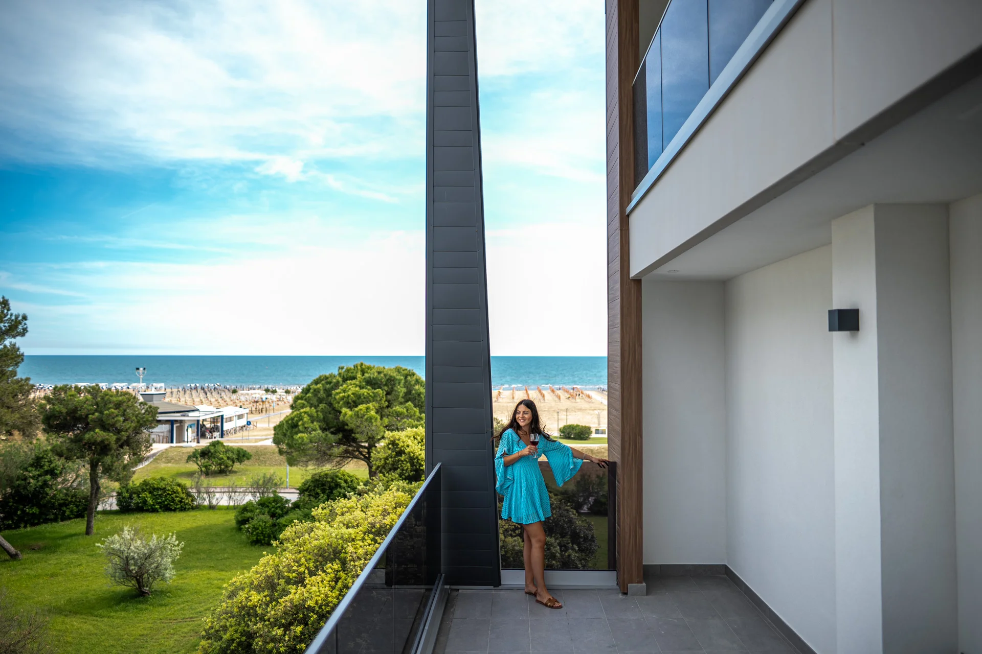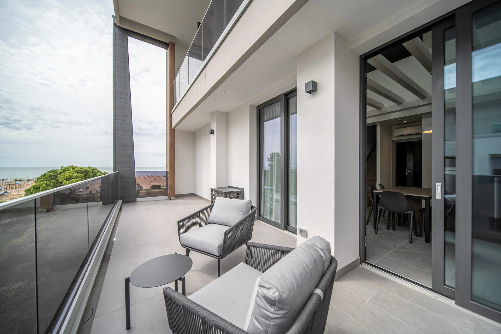 All’esterno, l’ampio terrazzo con vista mare laterale e scorcio sul mare diventa lo spazio ideale per colazioni all’aperto e momenti di quiete. Un appartamento pensato per rallentare, vivere la luce e lasciarsi accompagnare dal richiamo del mare.