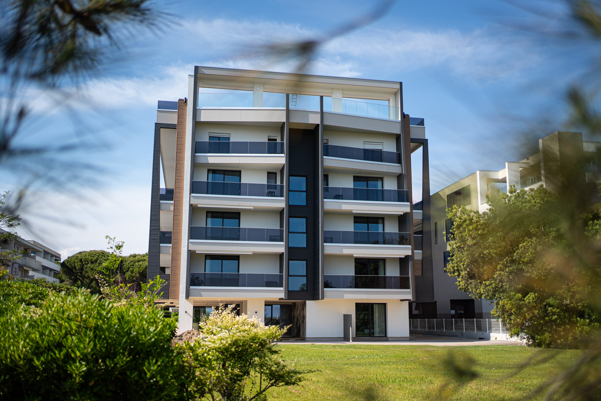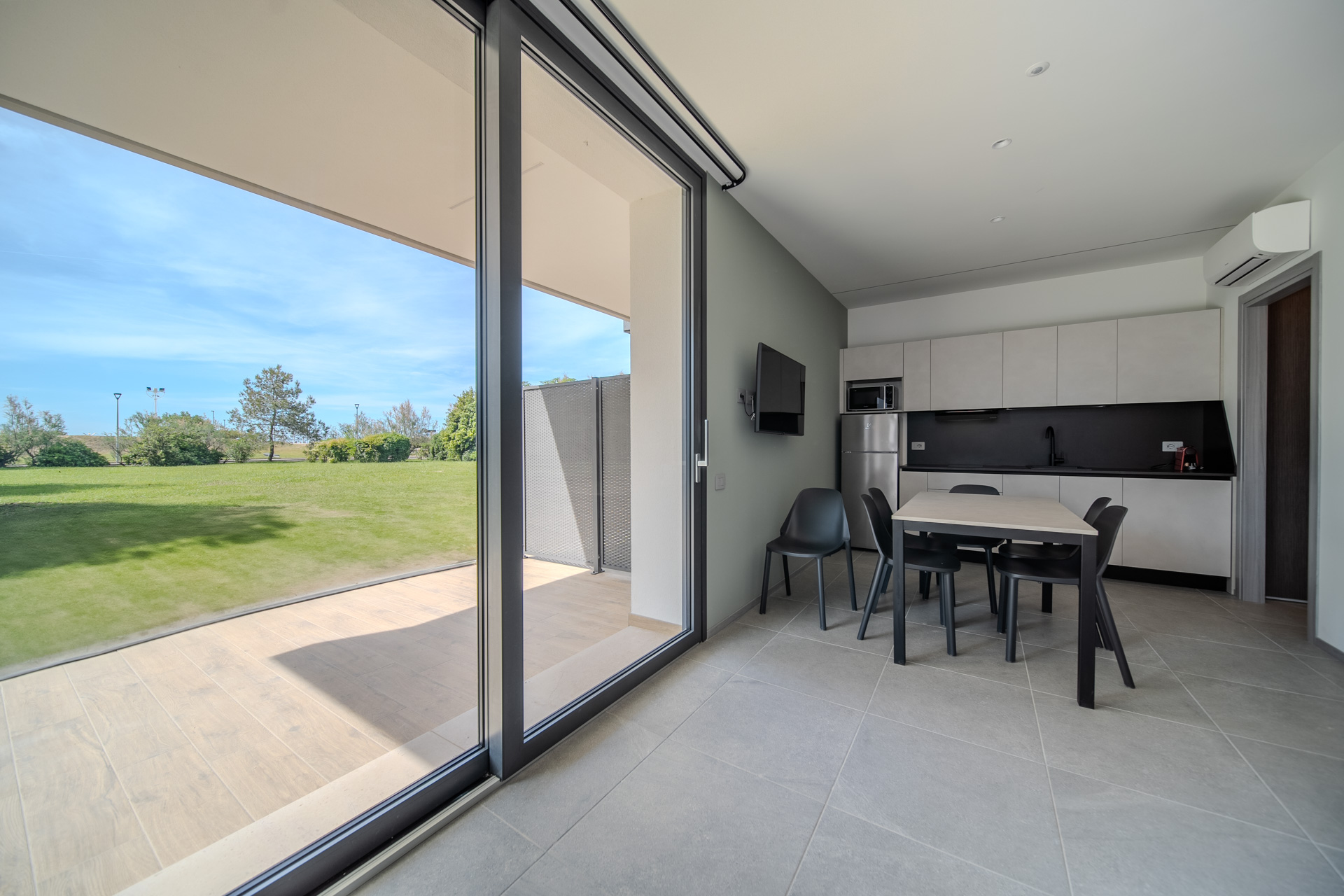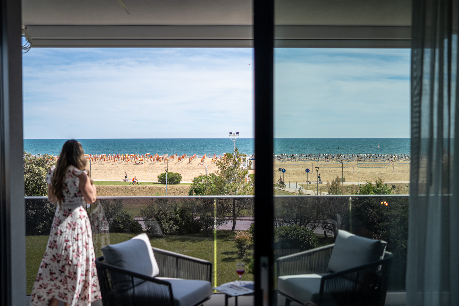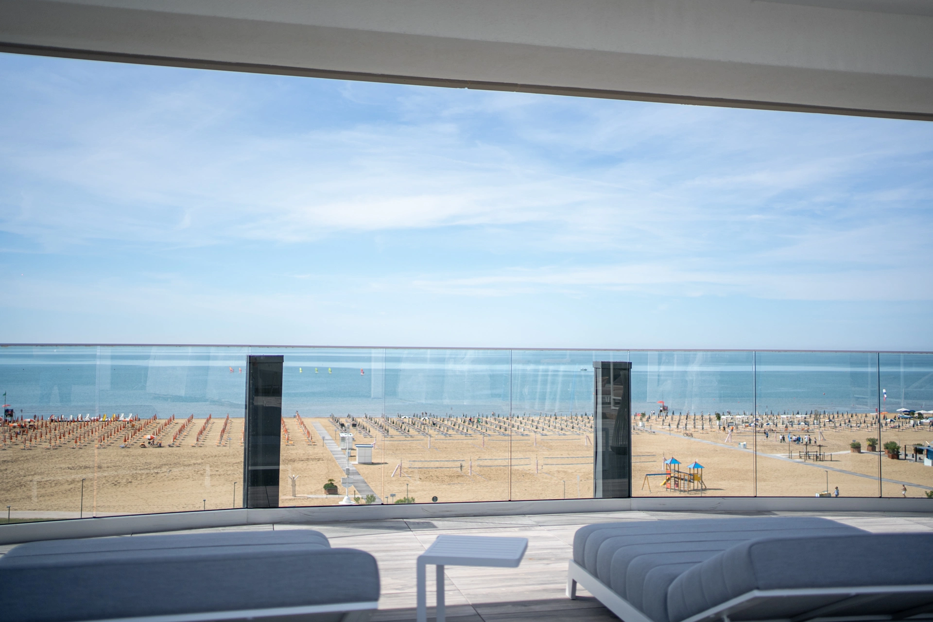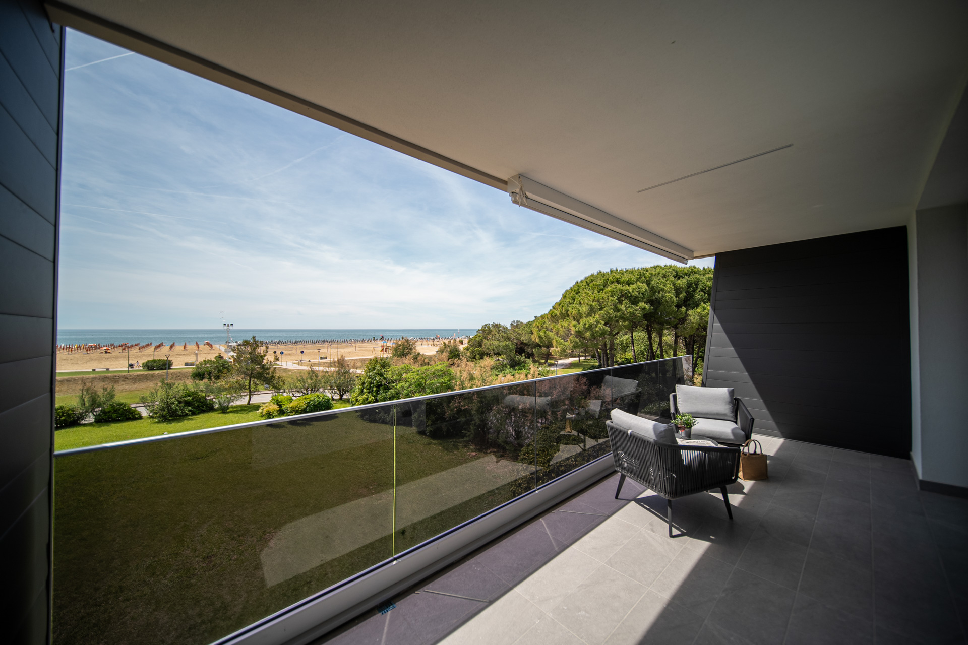 Balcone moderno con poltrone e tavolino, vista sul verde e scorcio di mare