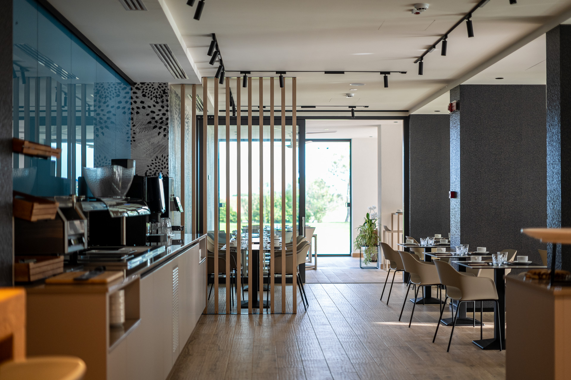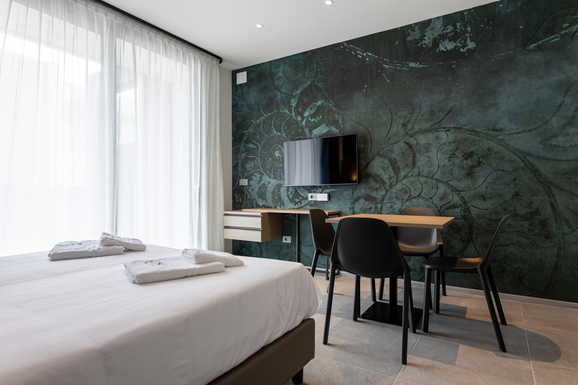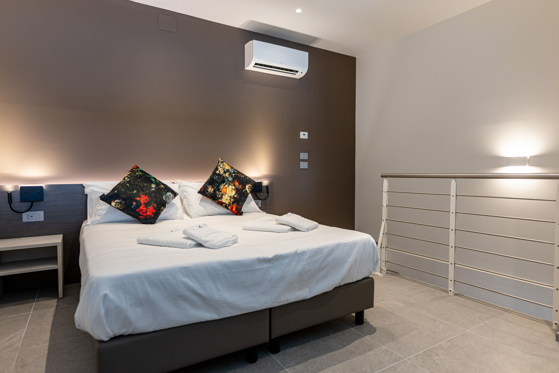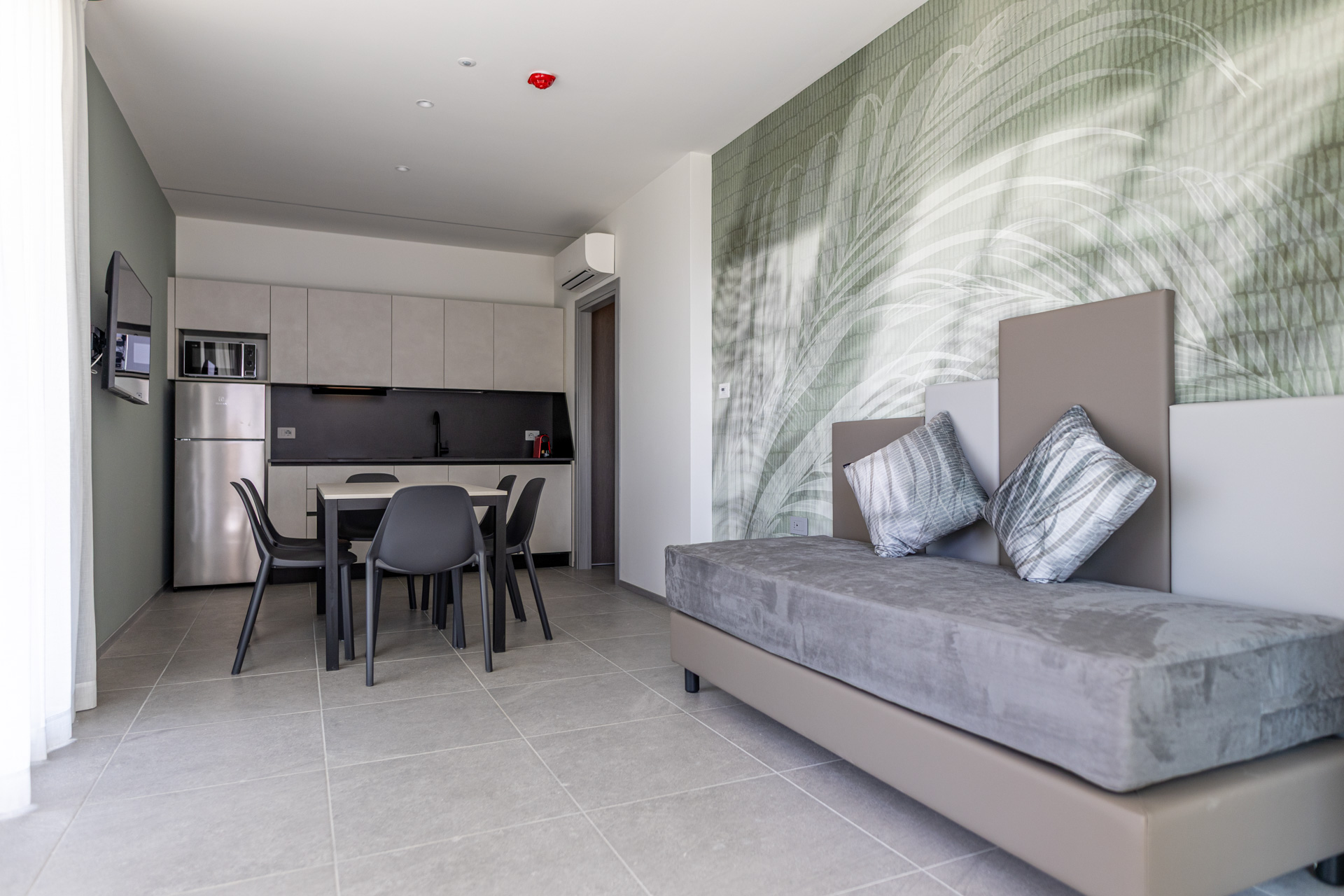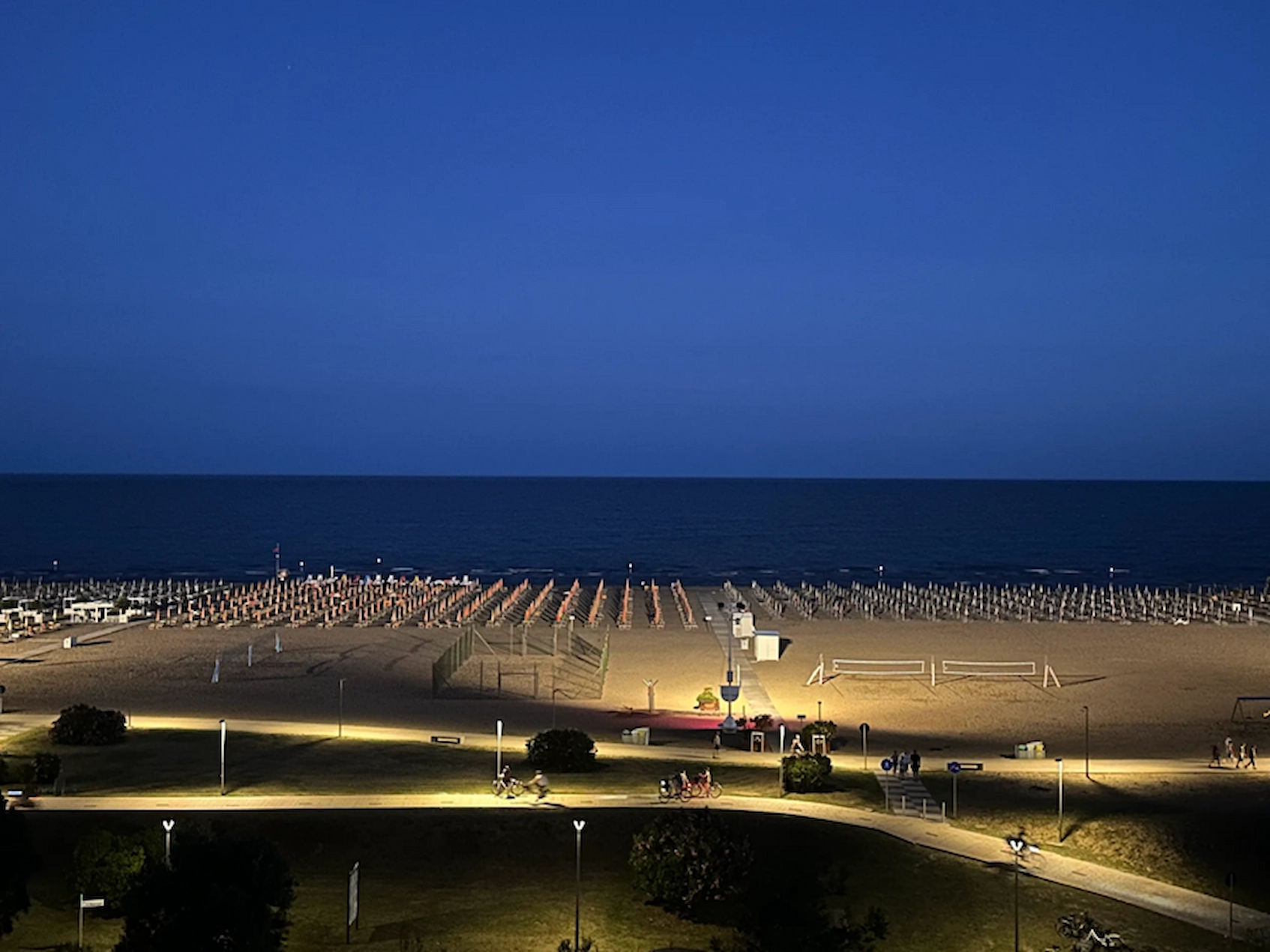 Balcone moderno con poltrone e tavolino, vista sul verde e scorcio di mare