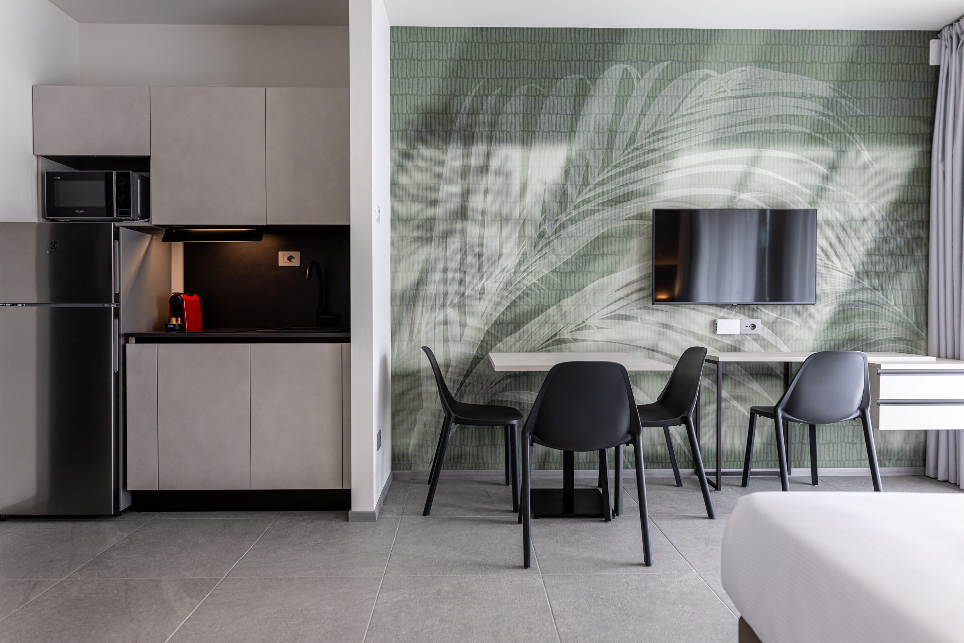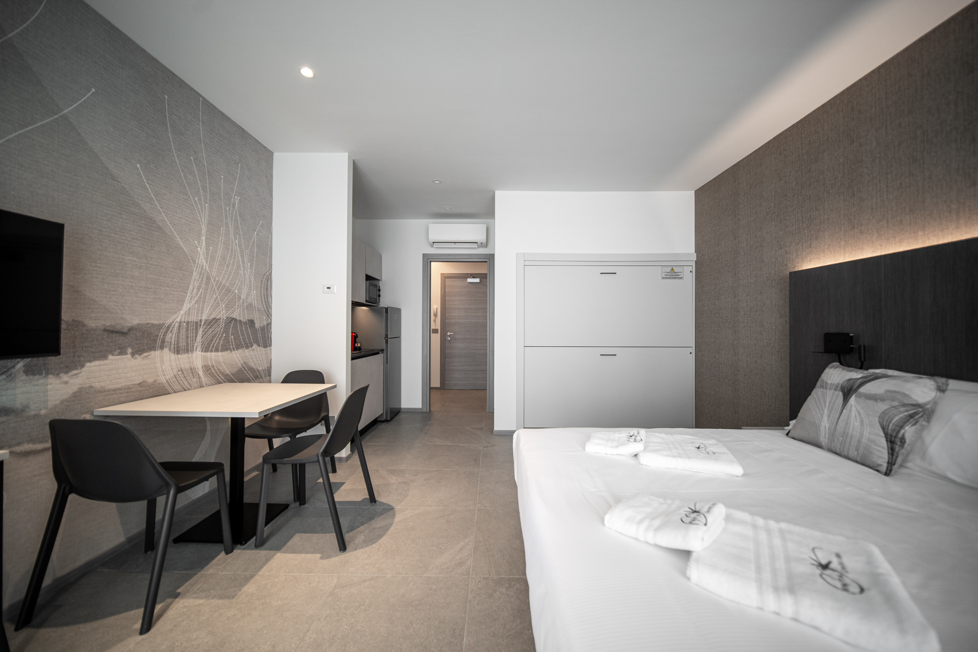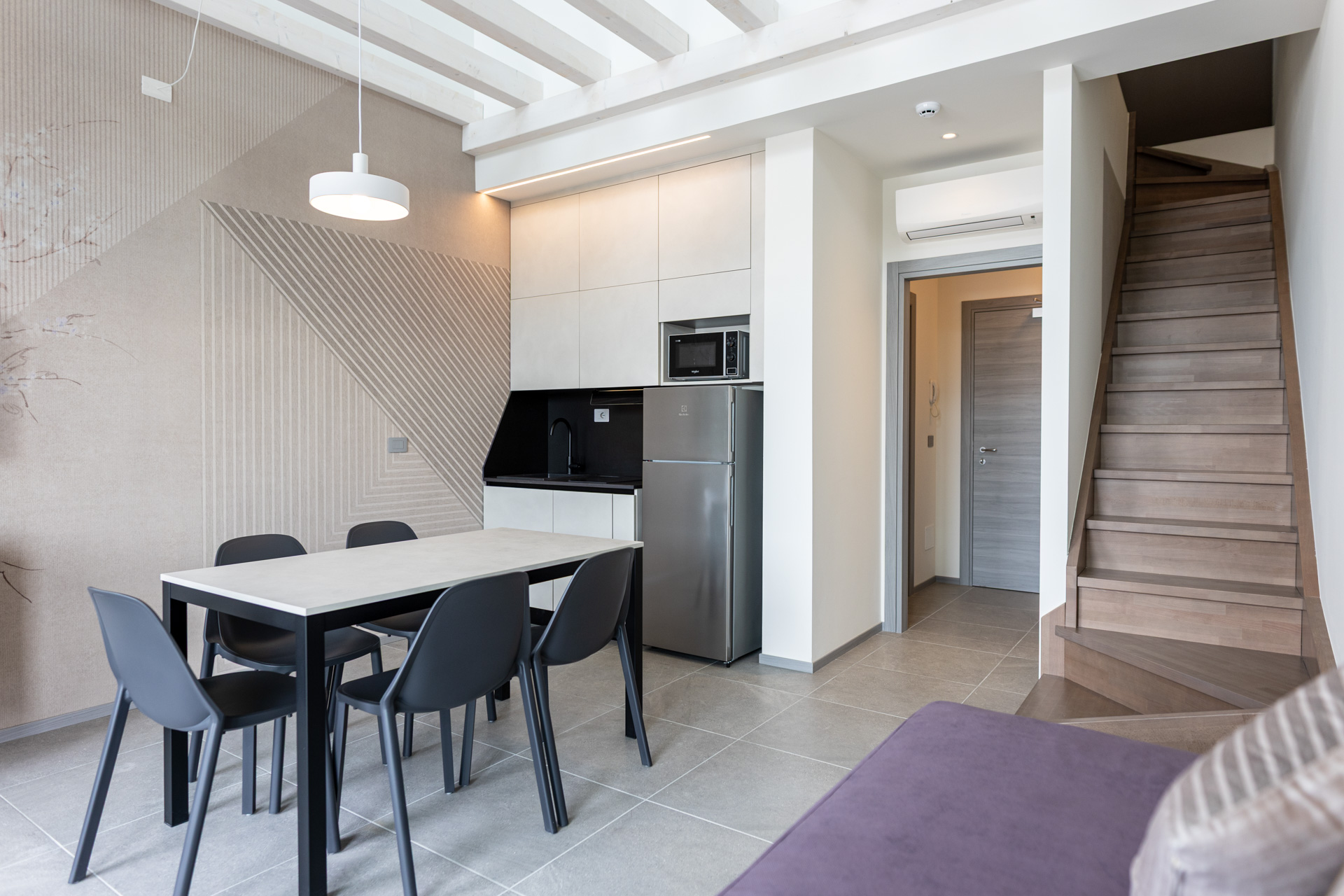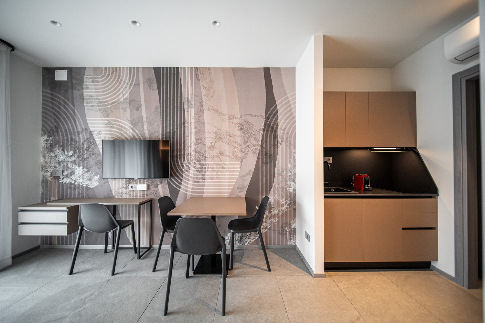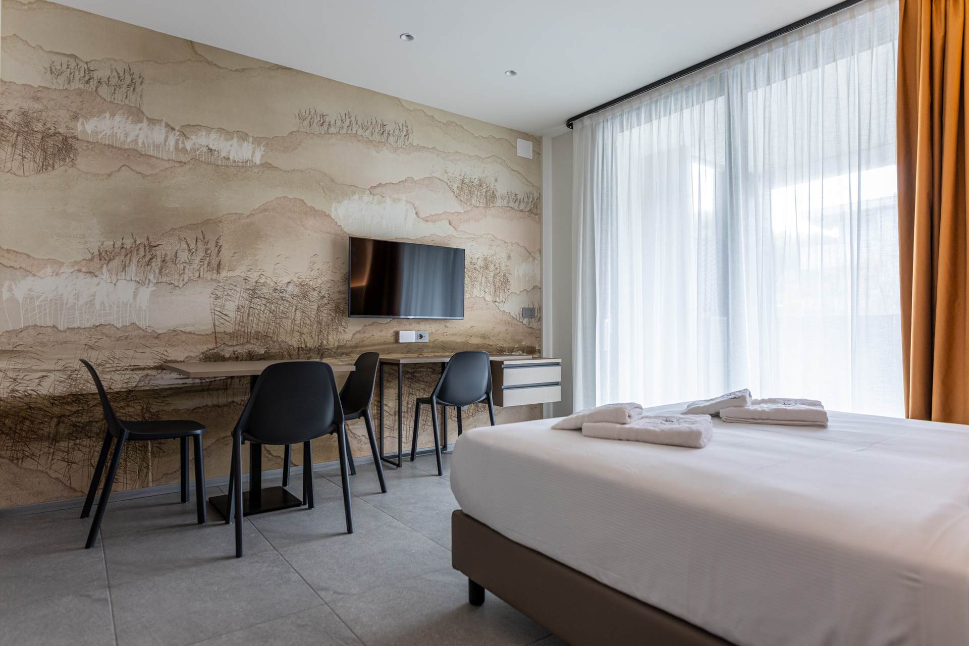 Balcone moderno con poltrone e tavolino, vista sul verde e scorcio di mare