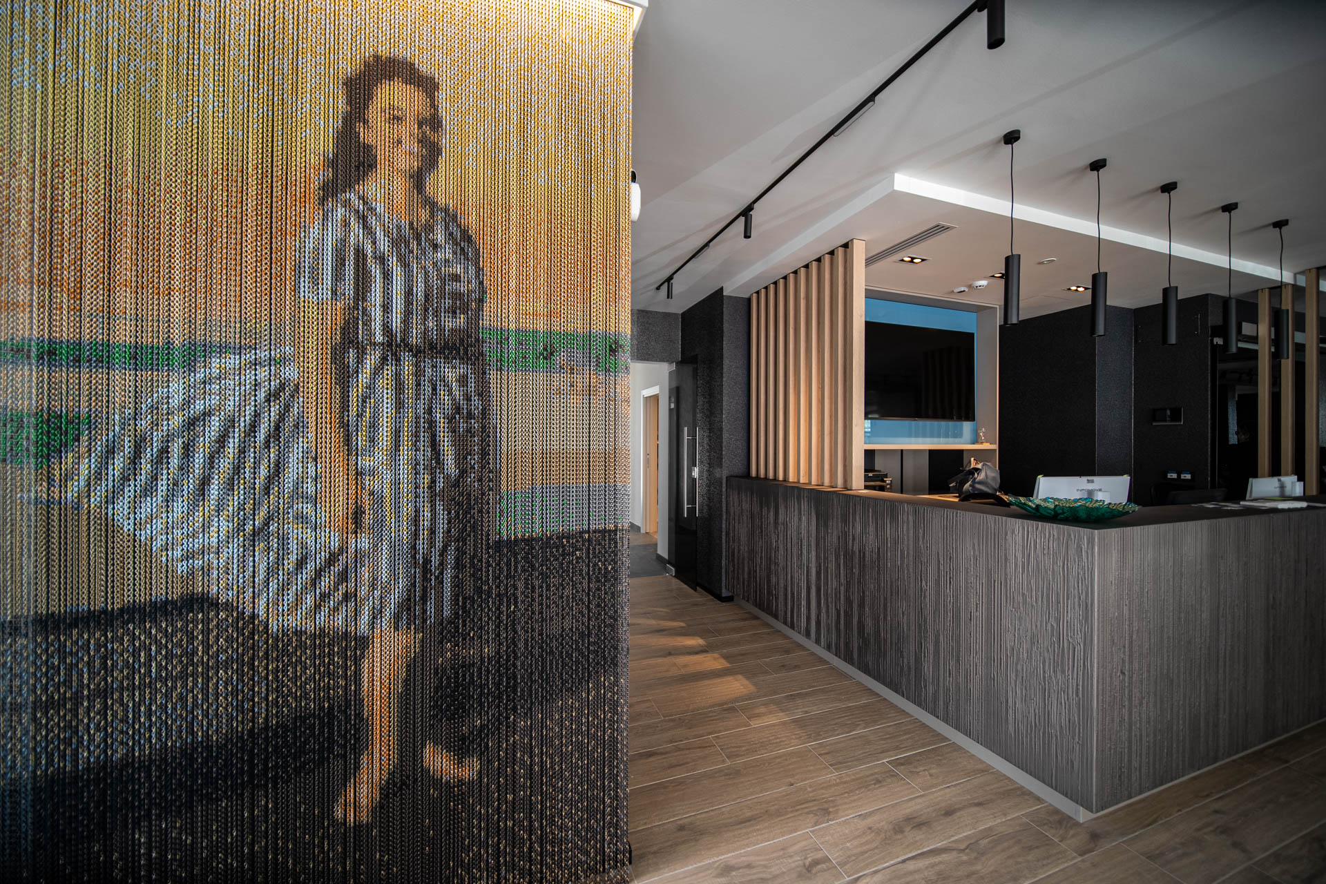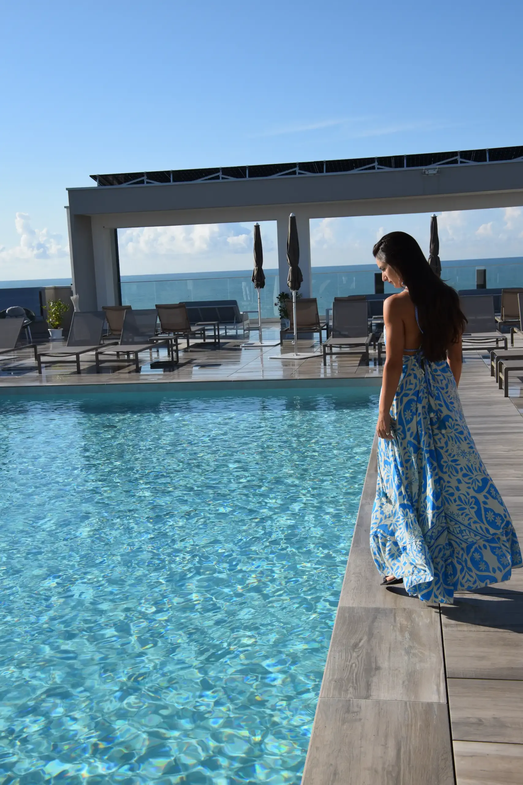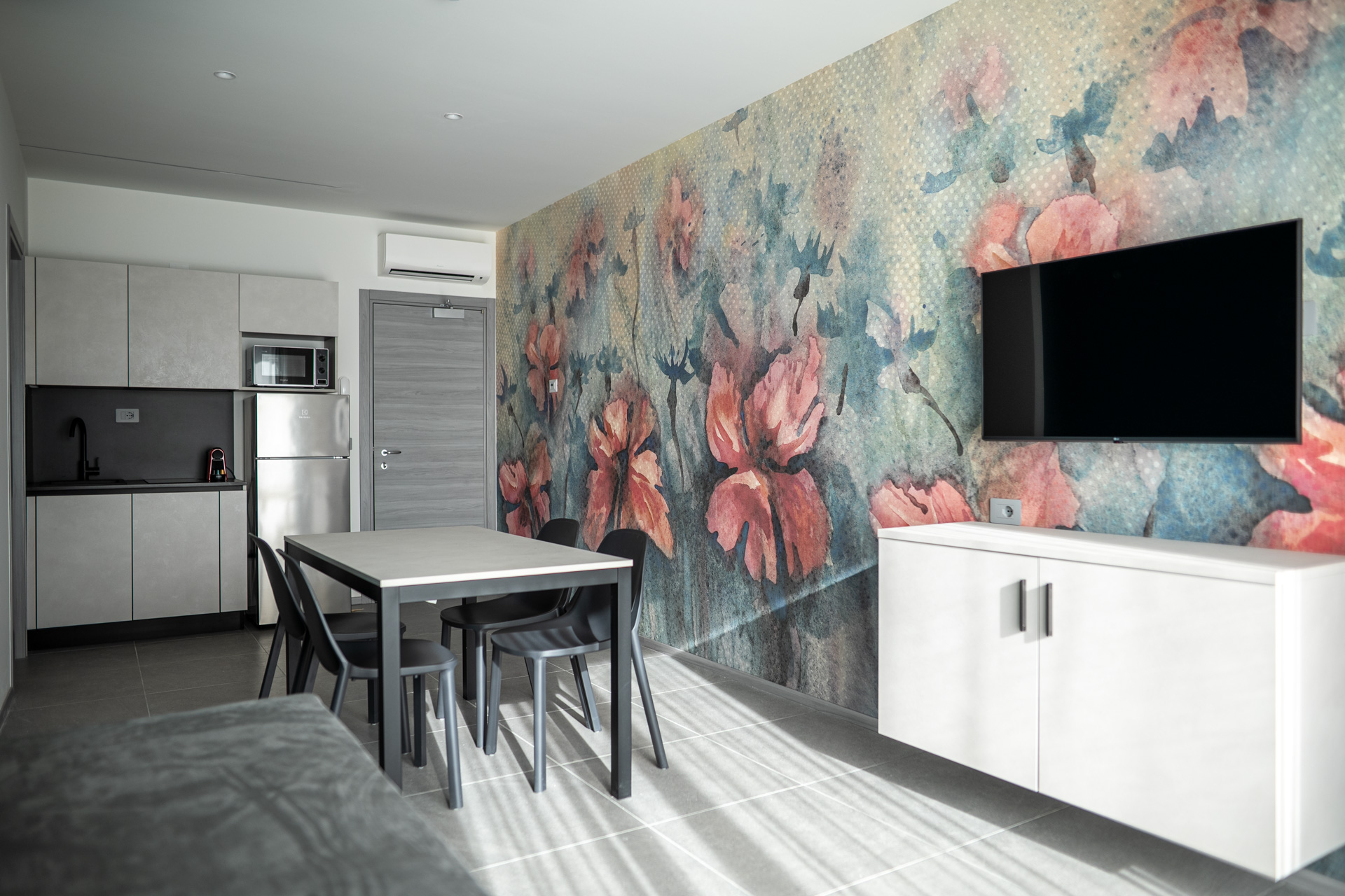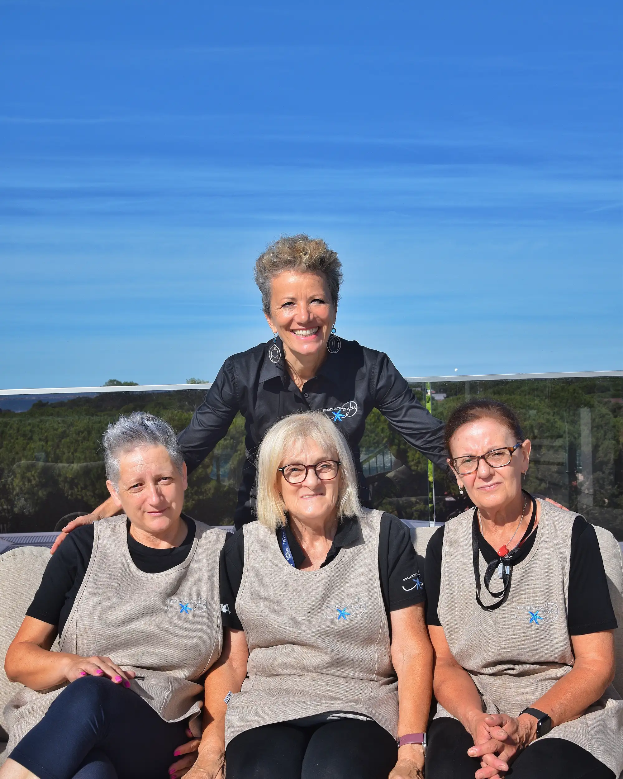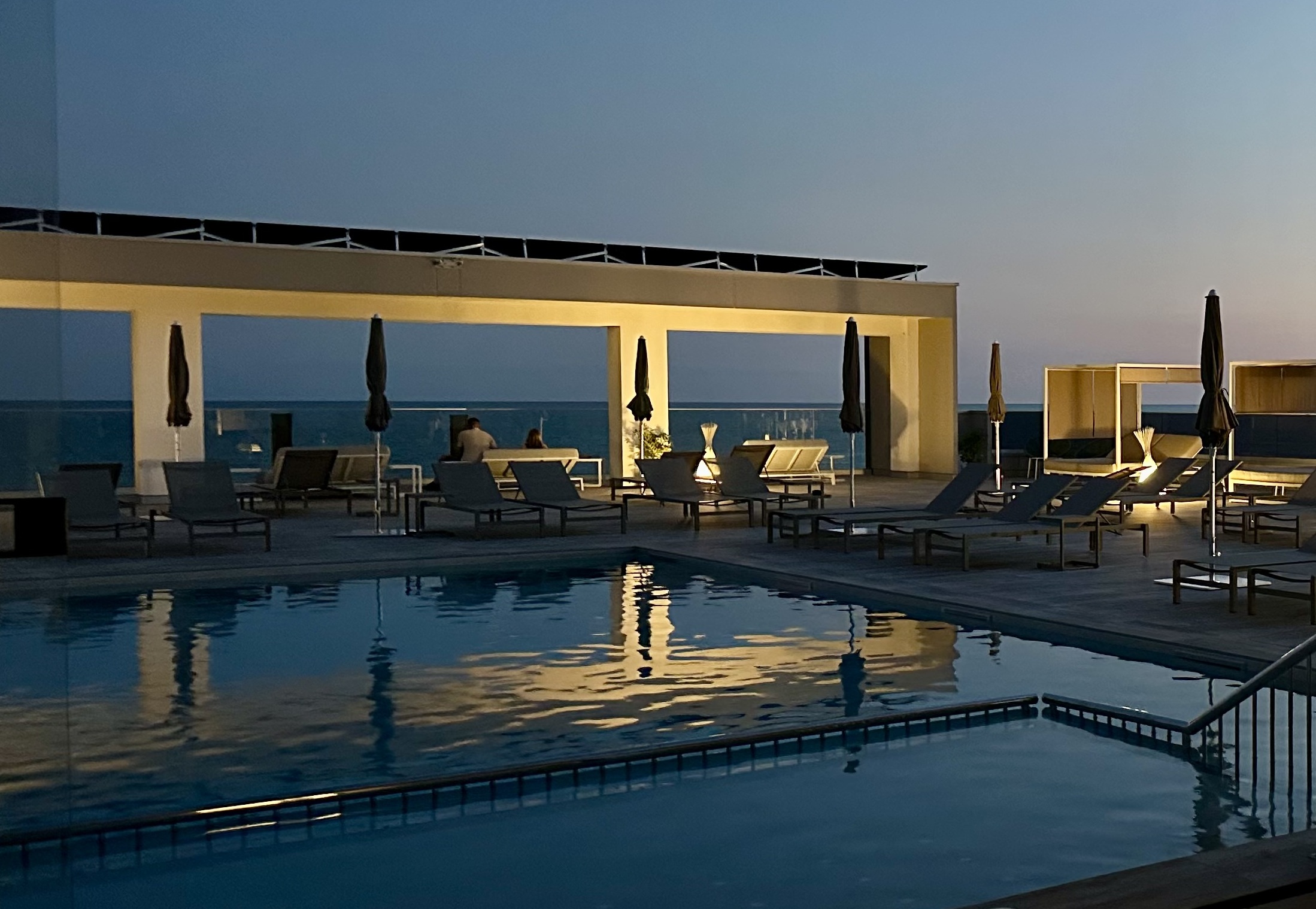Balcone moderno con poltrone e tavolino, vista sul verde e scorcio di mare