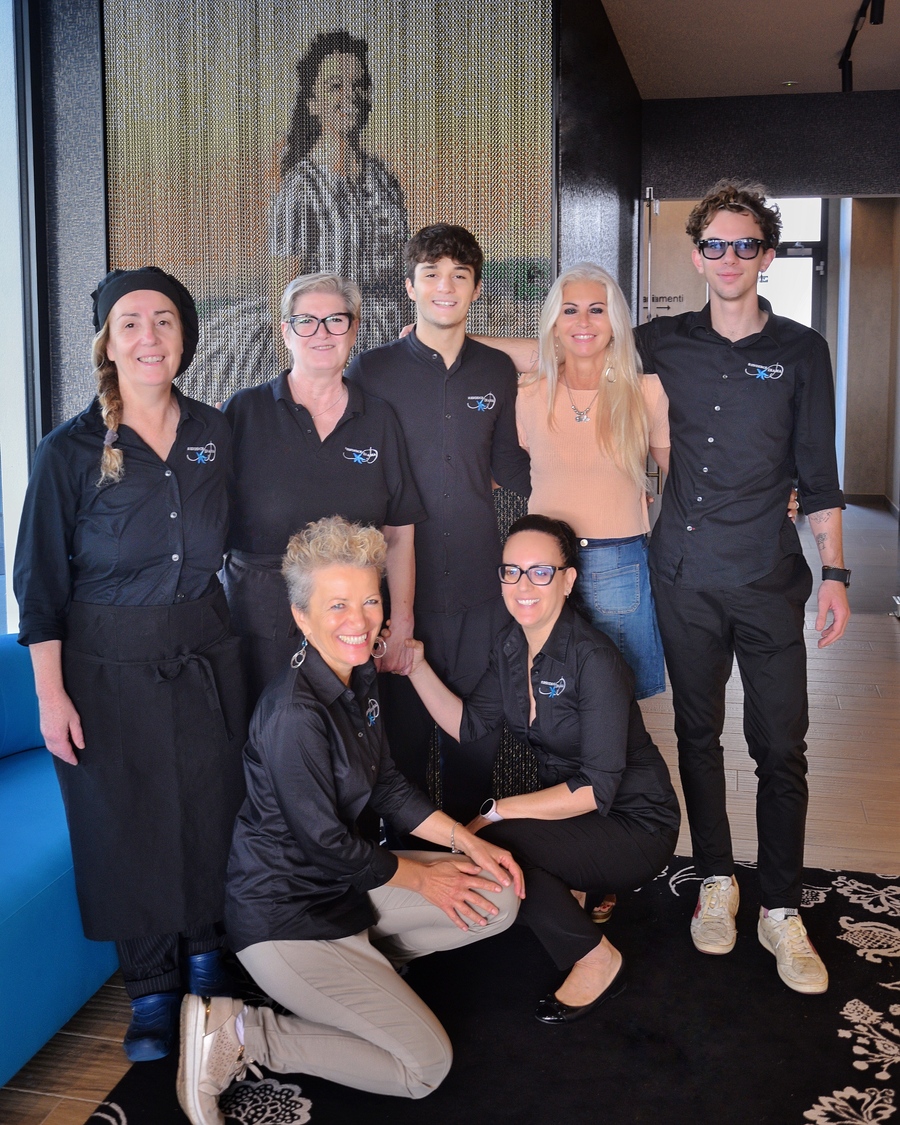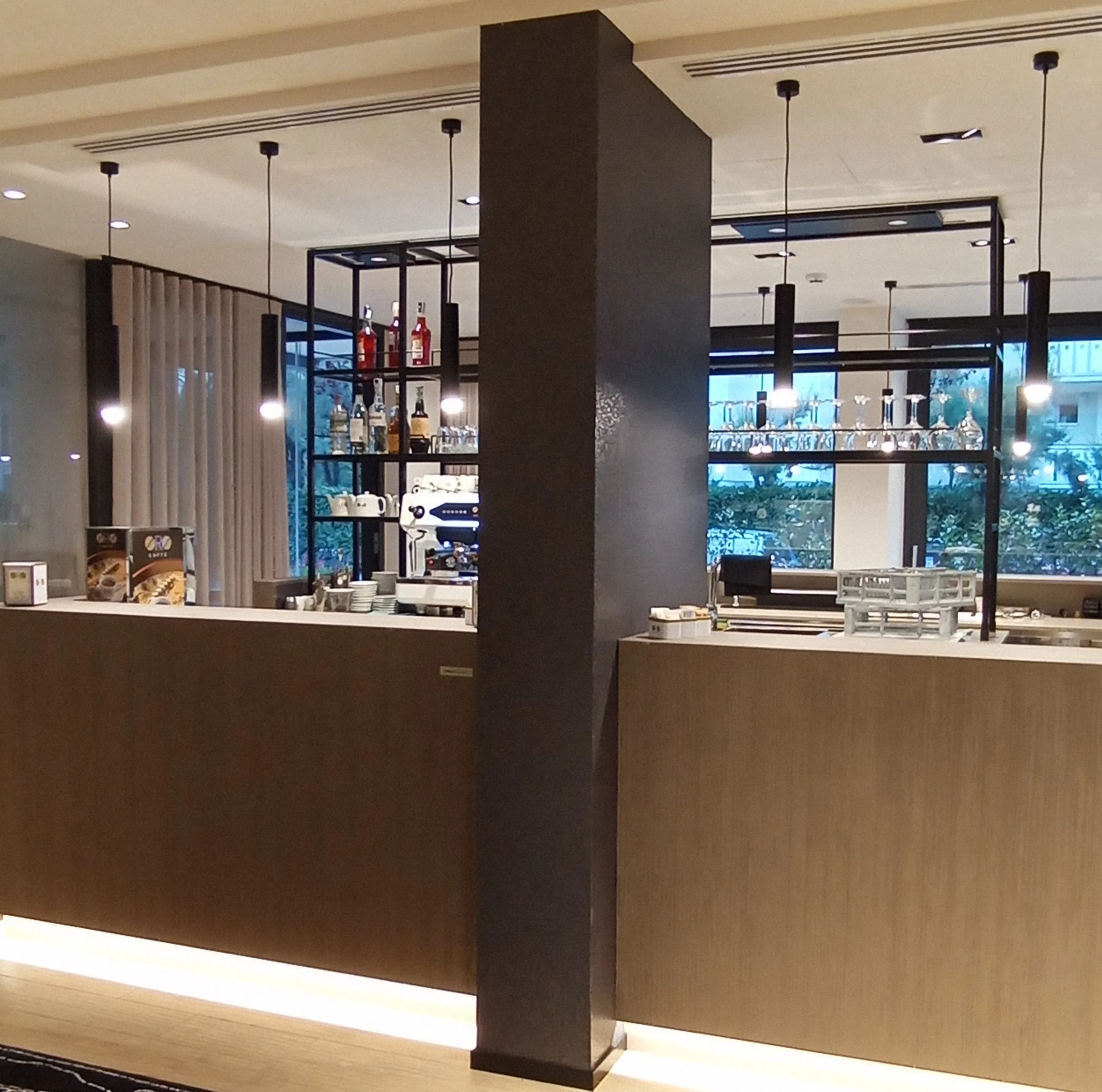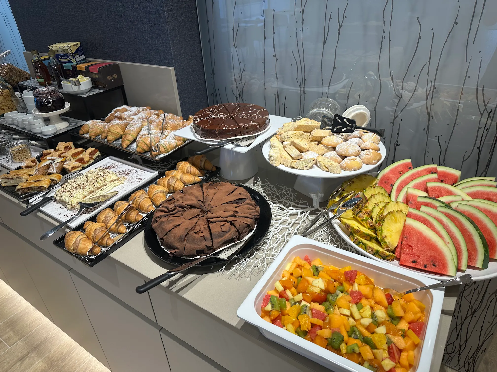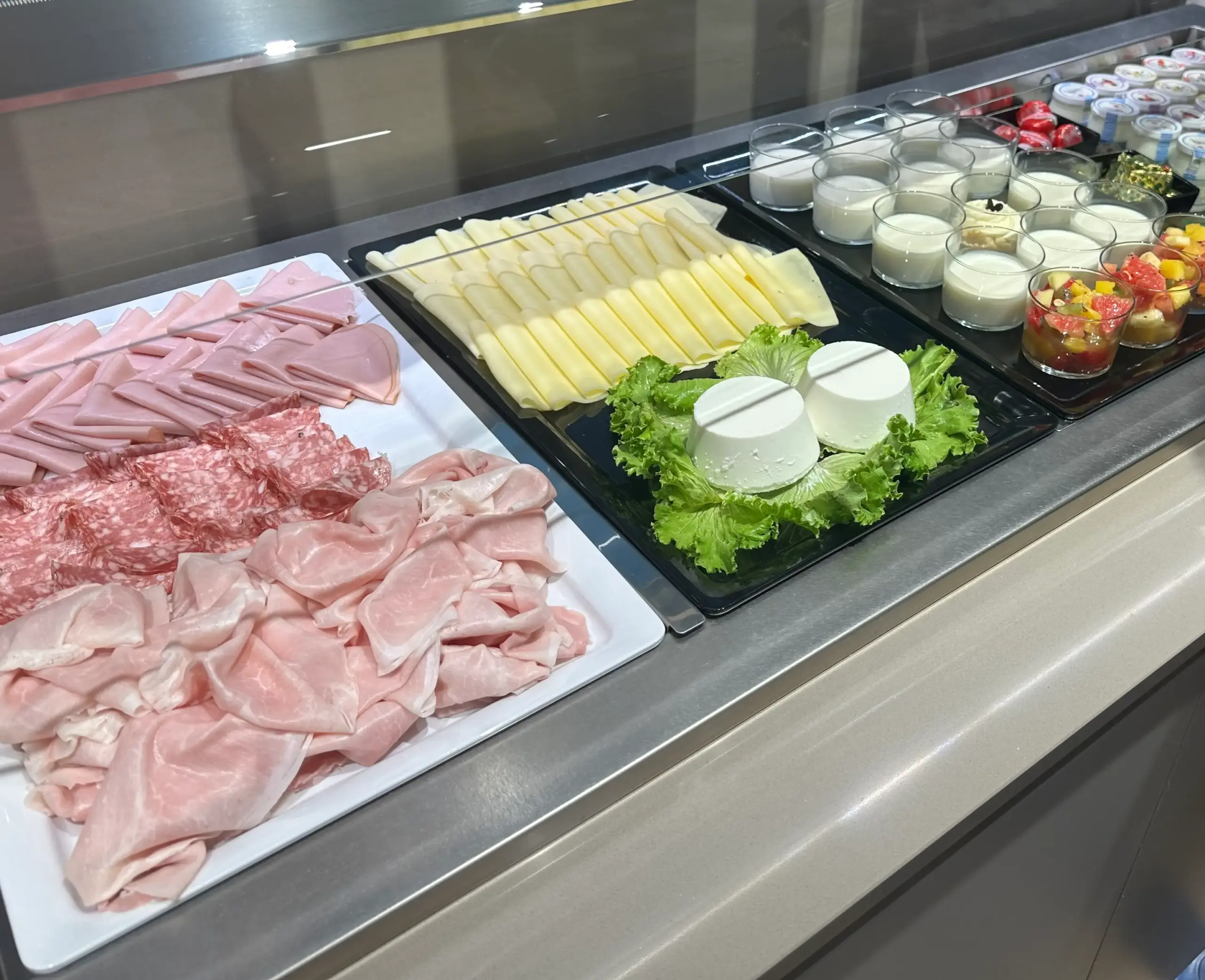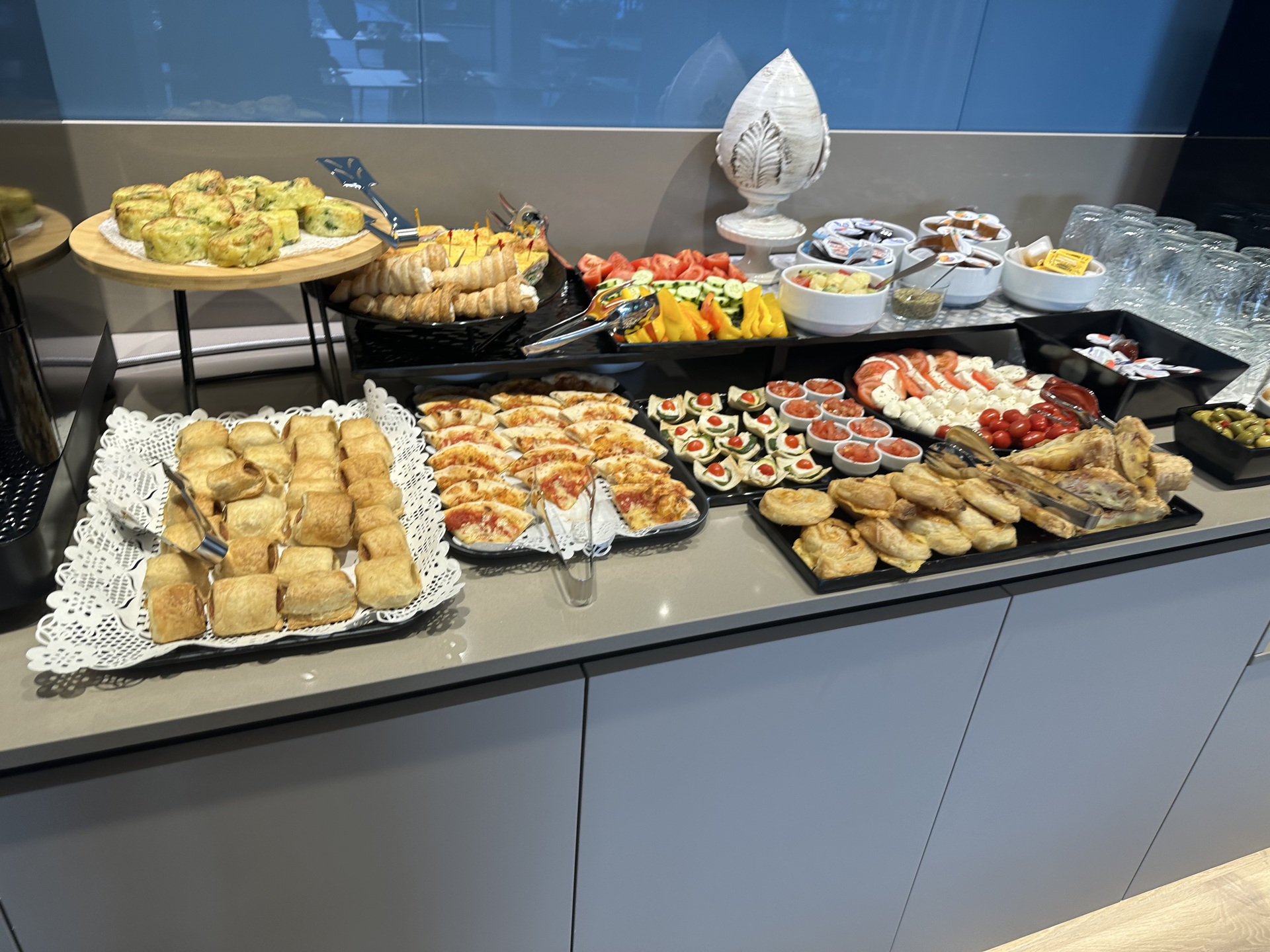 Balcone moderno con poltrone e tavolino, vista sul verde e scorcio di mare
